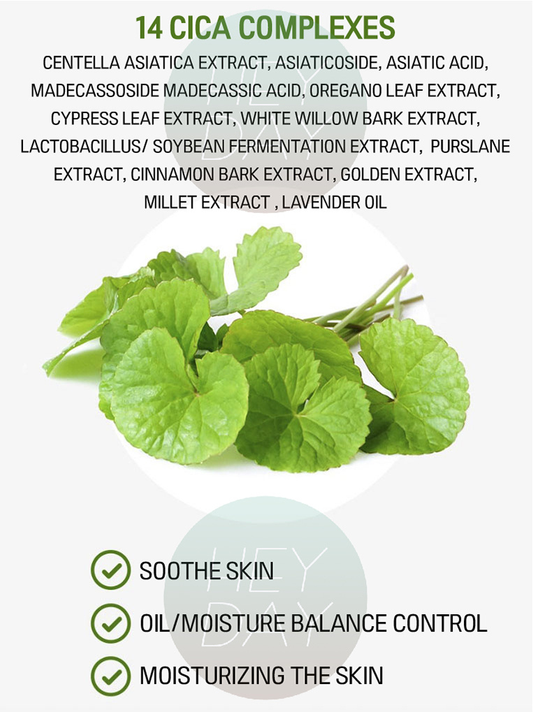 Centella Asiatica and its derivatives- hydrate and soothe the skin, reduce irritation and redness.
