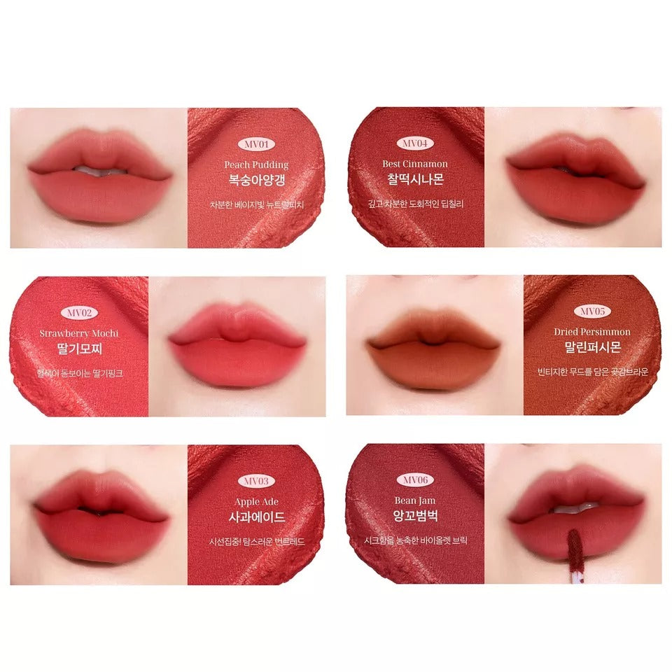 A velvet-type lip tint comes with 6 moody natural shades to create various daily makeup looks. With a soft and smooth texture that blends perfectly onto lips without caking.