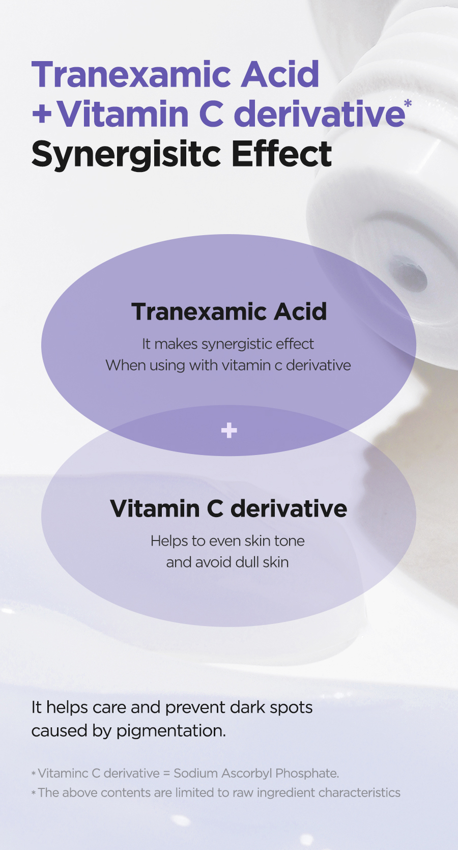 Contains Tranexamic Acid and Vitamin C derivatives to even skin tone and tackle pigmentation.