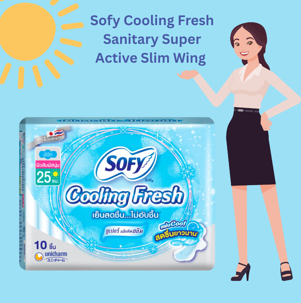 Sofy Cooling Fresh Sanitary offers superior absorption for worry-free protection during heavy flow, is infused with natural plant essential oil to help reduce odor, and is hypoallergenic tested for sensitive skin.